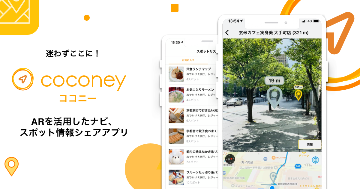 『coconey(ココニー)』は、ARナビによる新たな移動体験と、店舗や施設などの情報を共有するプラットフォーム型SNSの側面をもった、スマホ1つでお出かけをもっと楽しくするサービスです。
