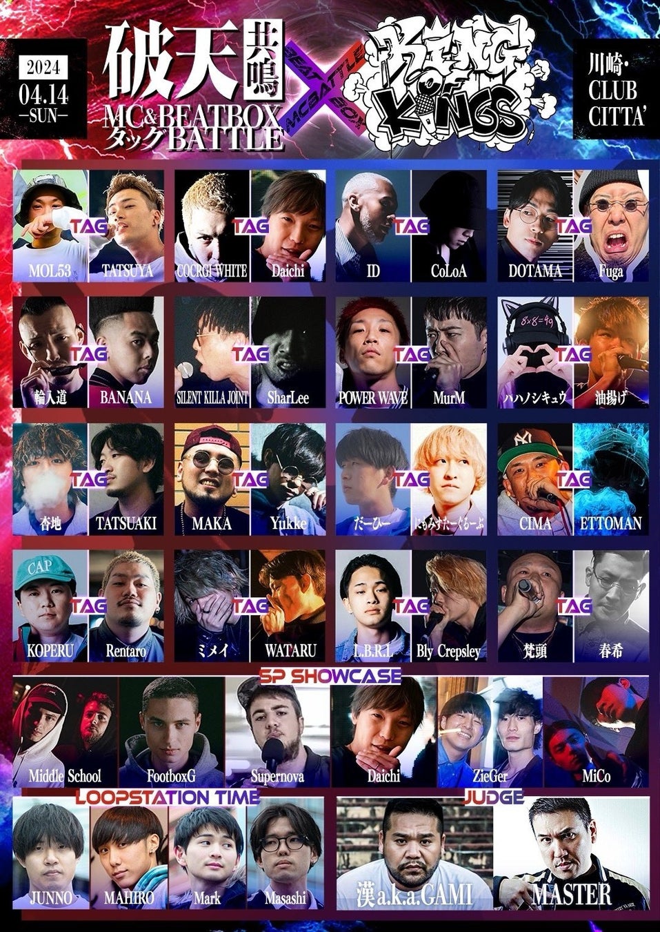 株式会社イザナギゲームズは、2024年4月14日にCLUB CITTA’で『破天共鳴MC&BEATBOXタッグBATTLE × KING OF KINGS』を開催します。
