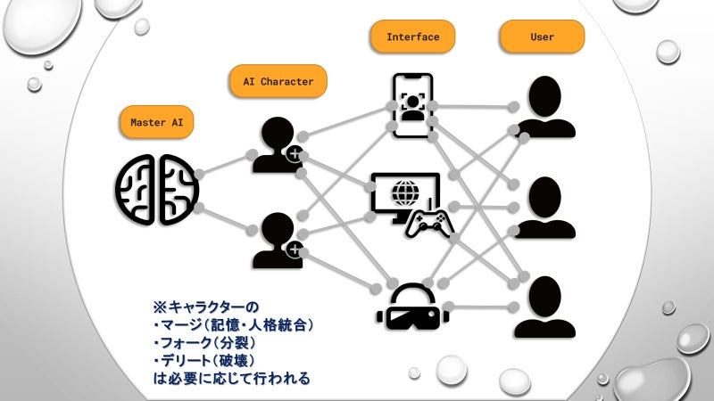 AIキャラクターは、ユーザー一人一人との会話や出来事を漏れなく記憶する能力や任意の時点での分裂、収縮能力を備え、個別のユーザーとの関係の継続的な発展を可能にする。