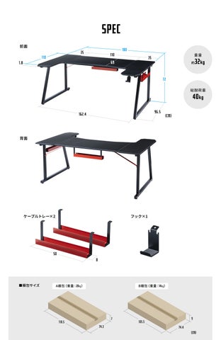 - 電源タップ受けやフック付属、クランプ対応天板、ケーブル通し切り欠き