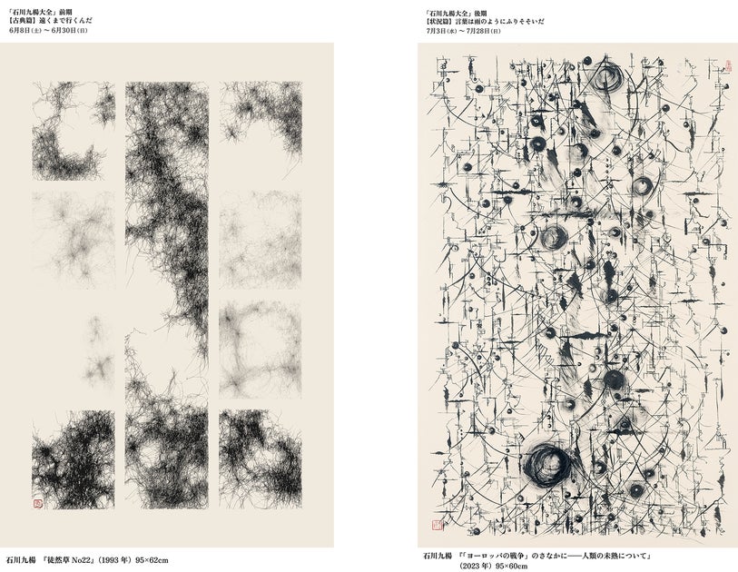 石川九楊の書作品2,000点から厳選した300点余りが展示され、前期は古典文学をテーマに、後期は言葉の表現を中心に展示されます。