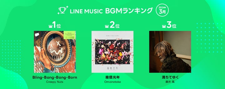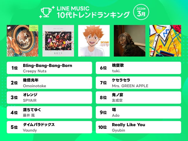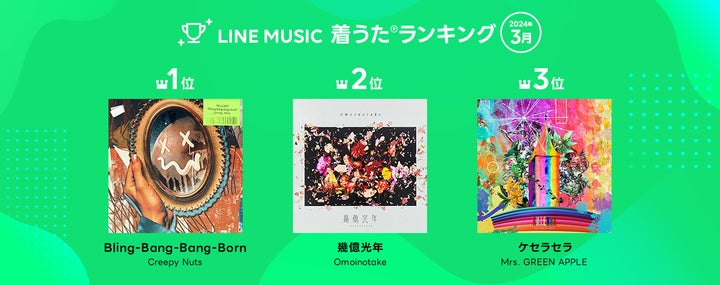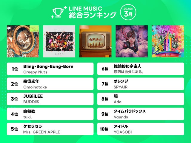 2024年3月の月間ランキングでは、Creepy Nutsの「Bling-Bang-Bang-Born」が1位を獲得し、話題を集めています。