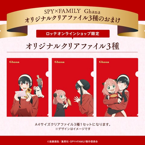 SPY×FAMILY Ghanaのオリジナルクリアファイル3種が付いており、12種類14品のガーナチョコが入っています。