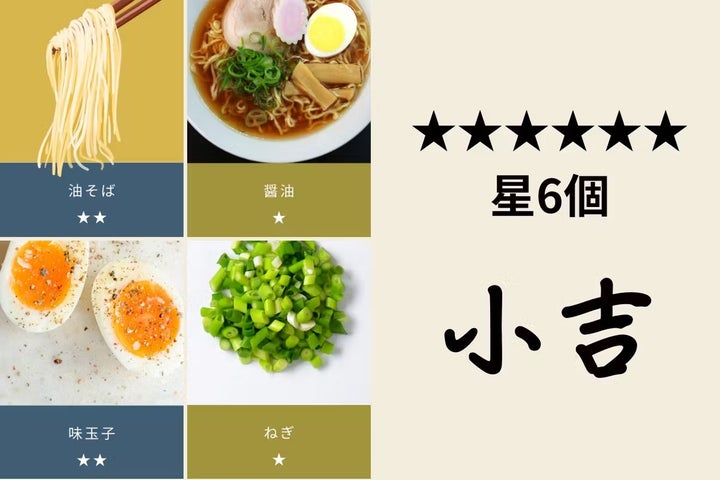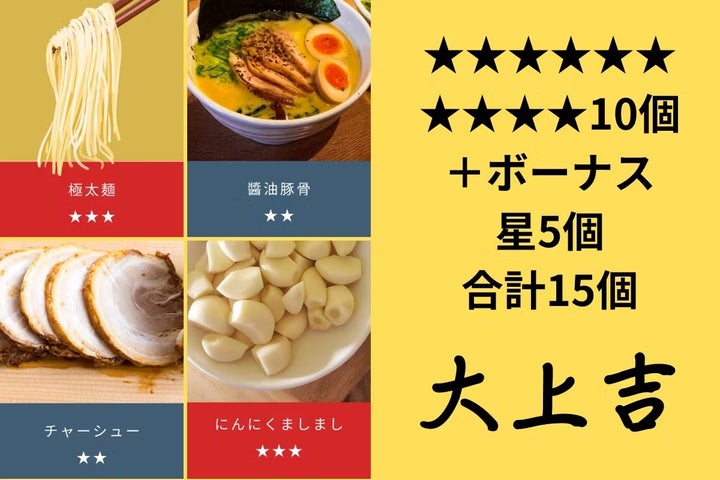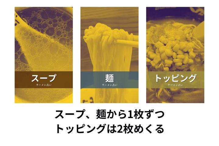 このゲームでは、スープ、麺、トッピングのカードを組み合わせて本日の運勢を占うことができます。