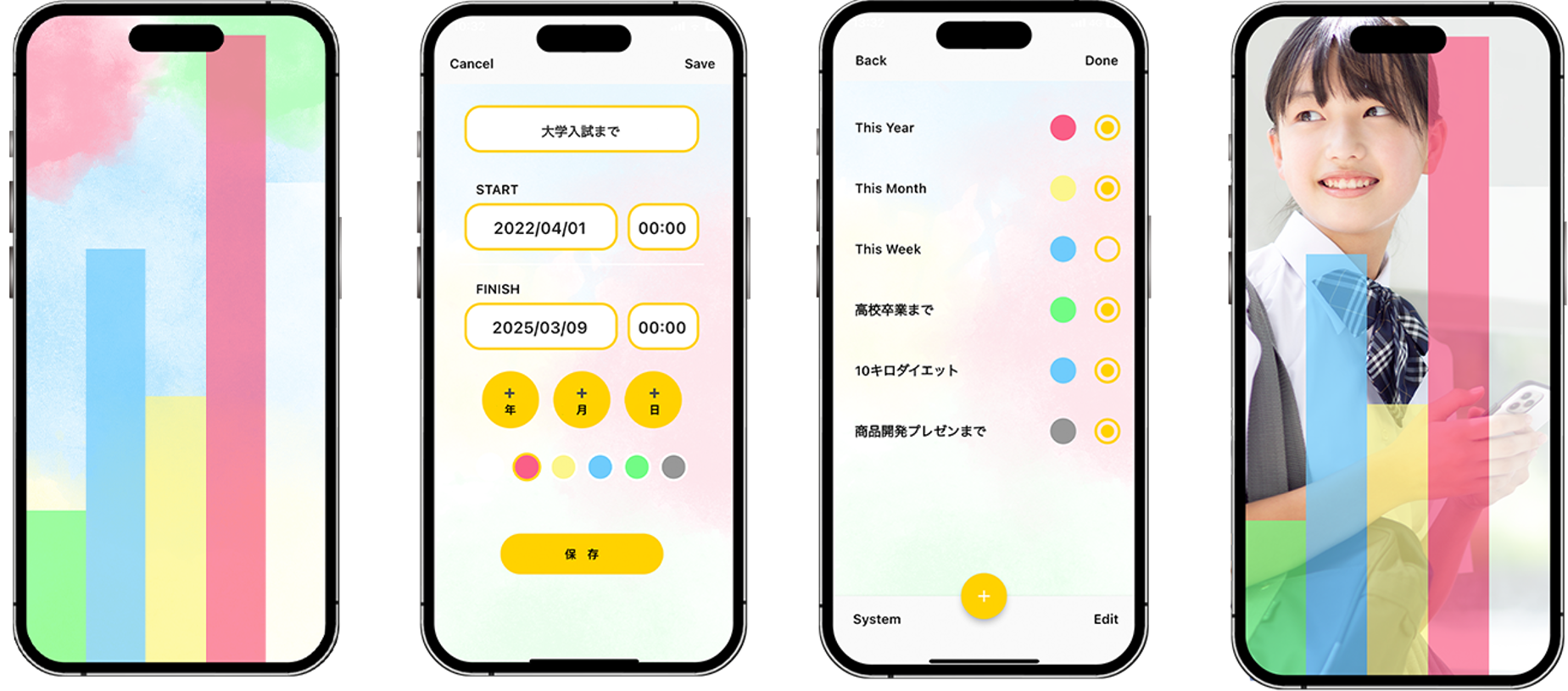 『MIERUE』は、ユーザーそれぞれの時間軸における始まりと終わりの時間を設定いただくことで、残り時間を「タイムスケール」という新しい時の見方で表示します。(図2)例えば受験までの残り期間や、仕事でのプロジェクトの締め切り、我が子が成人になるまでの期間などを設定すれば、ユーザーにとって意味のある時がタイムスケールで分かりやすく表示されます。従来のアナログ時計やデジタル時計とは異なり、それぞれのユーザーに対してパーソナライズされた時間を表示でき、また「タイムスケール」によって時が失われていくことを視覚的に実感しやすい設計となっているため、ユーザーそれぞれの時の価値がもっと見やすくなります。『MIERUE』は新しい時の見え方を提供することで、ユーザー一人ひとりが、より満足度の高い時を過ごし、それぞれが掲げる目標を達成しやすくなるようサポートします。