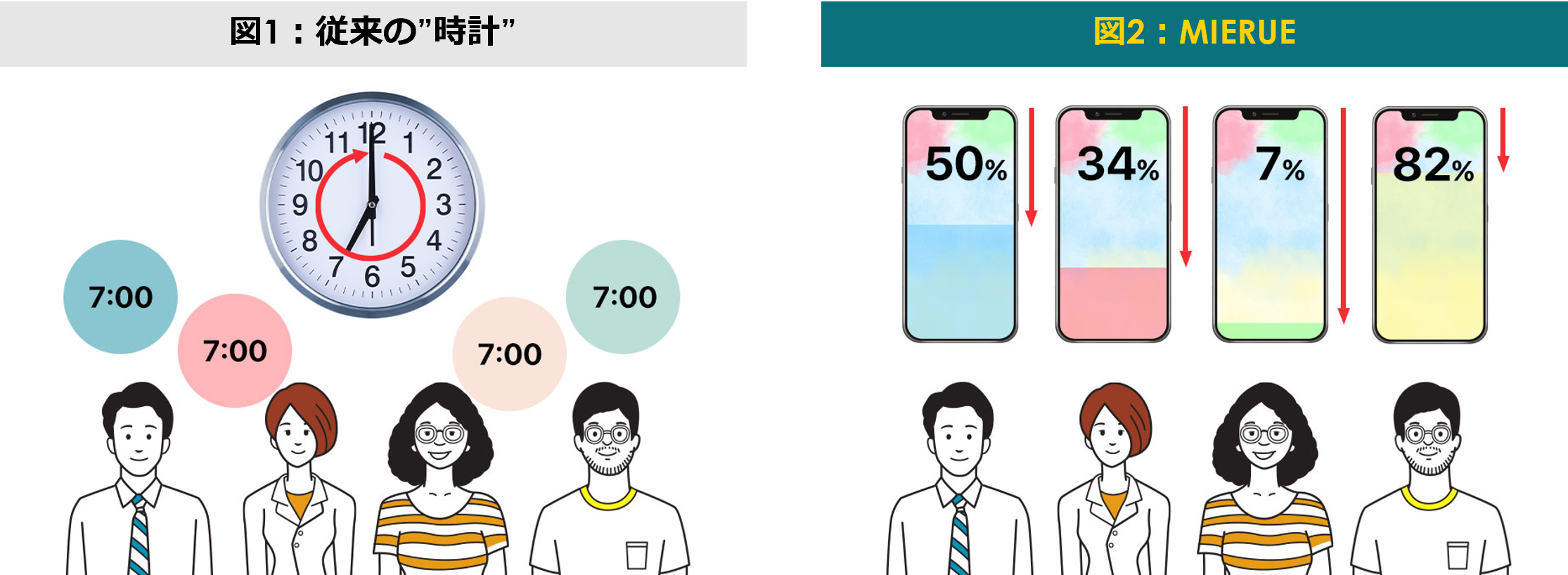 『MIERUE』は、ユーザーそれぞれの時間軸における始まりと終わりの時間を設定することで、残り時間を「タイムスケール」という新しい時の見方で表示し、それぞれのユーザーに対してパーソナライズされた時間を表示できる。
