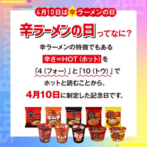辛ラーメンの日は4月10日で、辛ラーメンの特徴を表す記念日です。