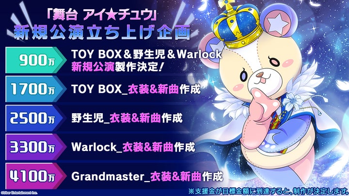 - 株式会社リベルエンタテインメントが『アイ★チュウPROJECT』内の2.5次元舞台化作品「舞台 アイ★チュウ」の新規公演立ち上げのため、クラウドファンディングを開始
