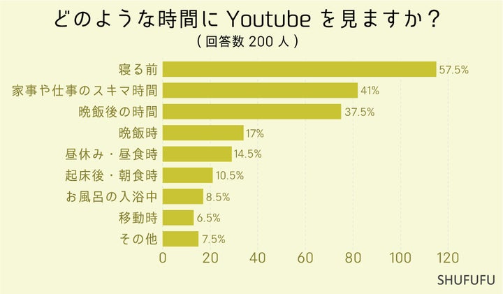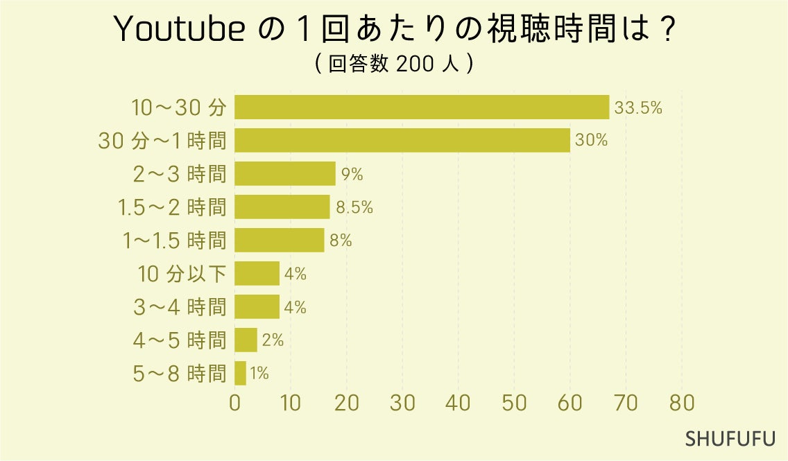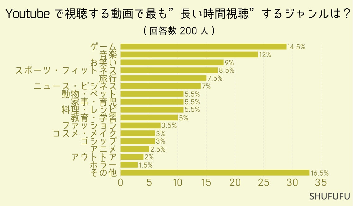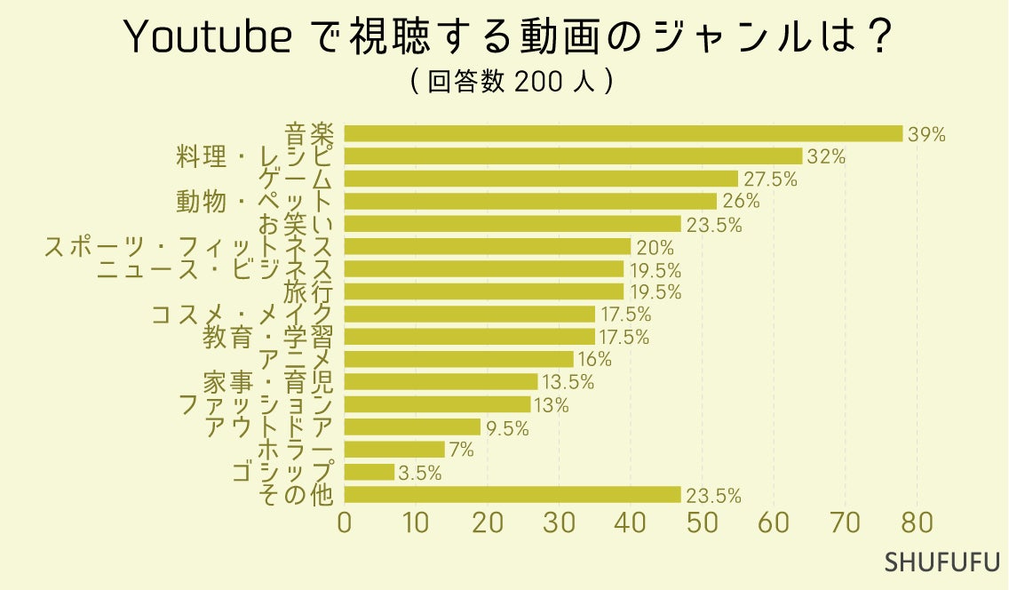 主婦向け情報メディア「SHUFUFU」が公表したYoutube動画に関するアンケート調査結果によると、男女200人を対象に視聴時間やジャンルについて調査が行われました。