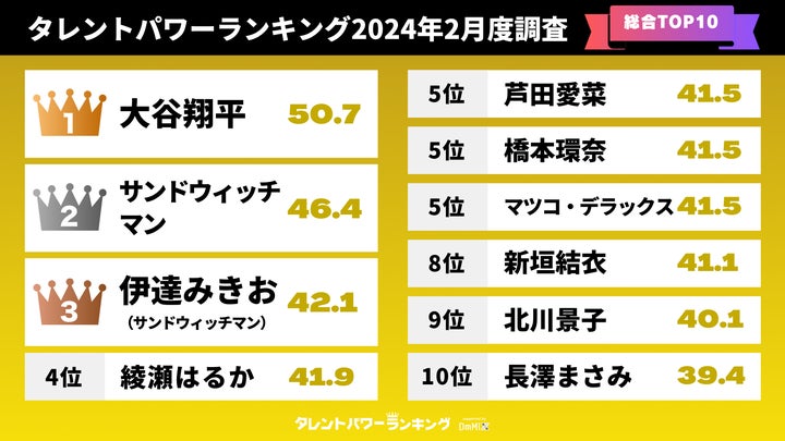 大谷翔平選手が4期連続で1位を獲得し、サンドウィッチマンが2位にランクインしました。