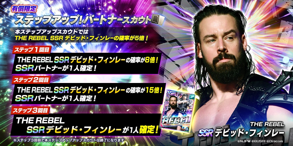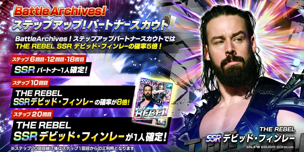 - 1. ブシロードとドリコムが共同開発した『新日本プロレスSTRONG SPIRITS』に新規SSRパートナー「[THE REBEL]デビットフィンレー」が登場。