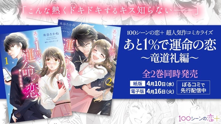 株式会社ボルテージは、「100シーンの恋+」内で配信中のタイトルを原作としたコミカライズ作品「あと1%で運命の恋~竜道礼編〜」の単行本を4月10日に全2巻同時発売しました。