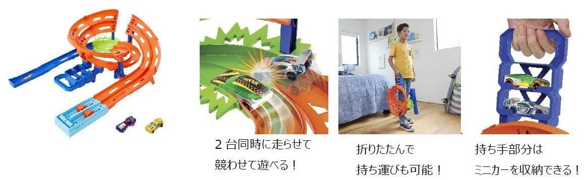 このプレイセットは、ミニカーを発射して迫力あるレースが楽しめるスパイラル型コースやクラッシュゾーンが特徴で、2台同時に競争できます。
