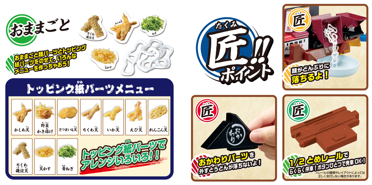 丸亀製麺は、お子さまが「うどん屋さん」や「お客さま」になりきって遊んでいただける「うどん体験」を通して、ご自宅でのお食事をより楽しんで欲しいという想いや、お子さまがワクワク楽しみながら食べ物のことを学んで欲しいという「食育」の想いがあり、本商品のお店駅や車両のデザイン、丸亀製麺のうどん職人気分を楽しめるオリジナルパーツのデザインを監修しています。