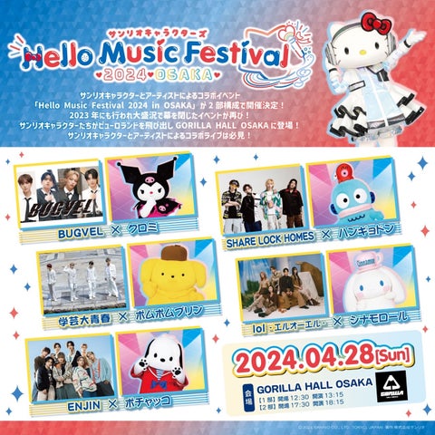 サンリオキャラクターとアーティストによるコラボライブが行われ、BUGVEL×クロミやSHARE LOCK HOMES×ハンギョドンなどが出演します。