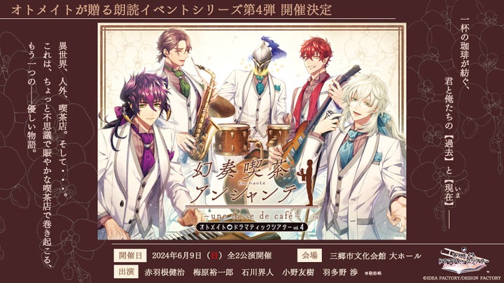 アイディアファクトリー株式会社の女性向けゲームブランド「オトメイト」が、2024年6月9日に開催されるイベント「オトメイトドラマティックシアターvol.04」の情報を公開しました。