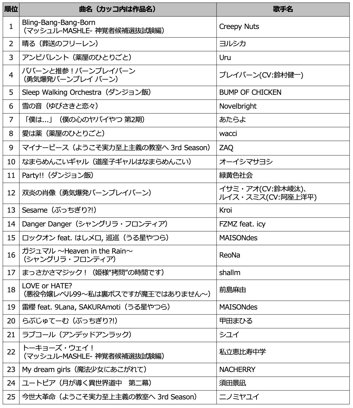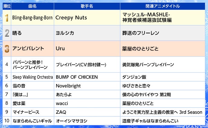 2位は『葬送のフリーレン』第2クールのOPテーマ「晴る」、3位は『薬屋のひとりごと』のOPテーマ「アンビバレント」。