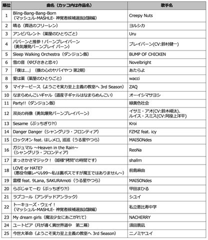 2024年冬アニメ主題歌ランキングTOP50発表!Creepy Nuts「Bling-Bang-Bang-Born」が圧倒的1位に