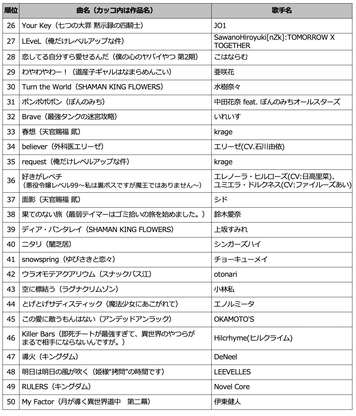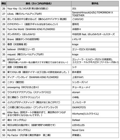 5位から10位までの楽曲も紹介され、アニメファンやアニソンファンにとって楽しい情報となっています。